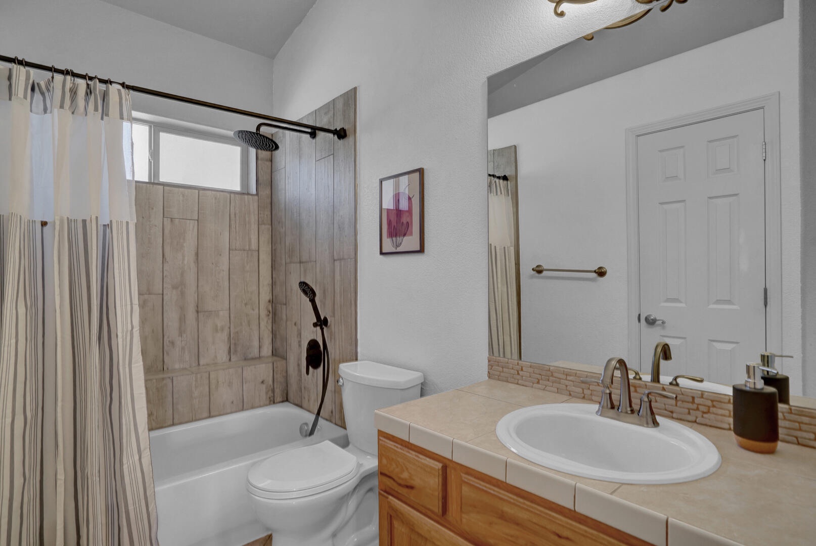 The tubs in the shower were in good condition so we left them. Then we replaced the shower heads and the handles so they all matched. I chose darker fixtures because they look cleaner longer and they are a more modern elegant look. A lot of times the silver or chrome fixtures start to look dirty really quickly. I picked shower fixtures that had spray handles, so it makes it easier to clean the showers and tubs.