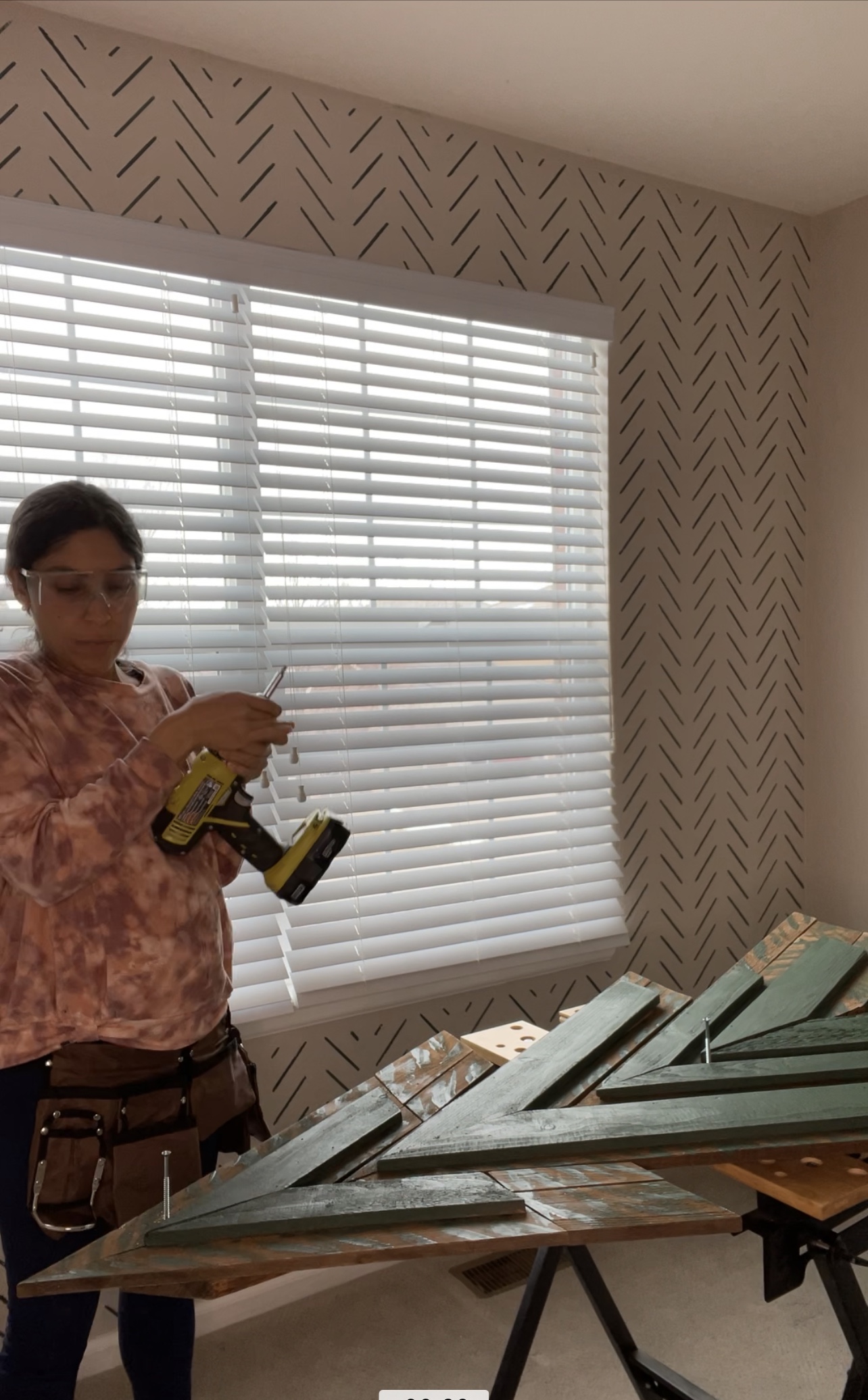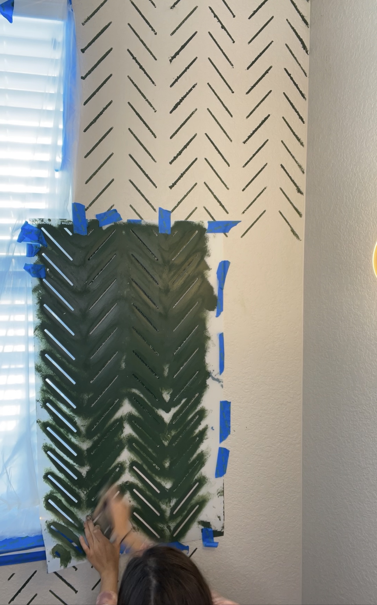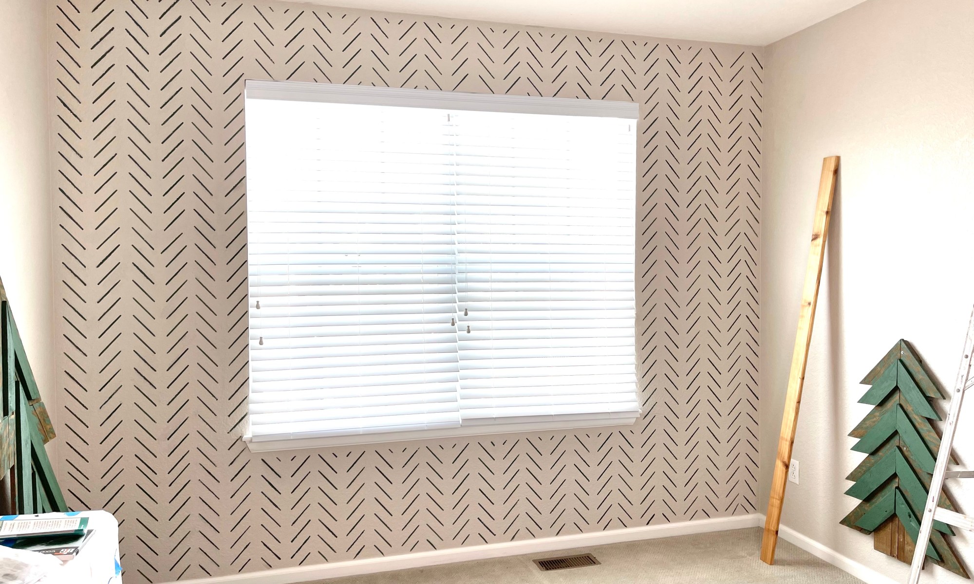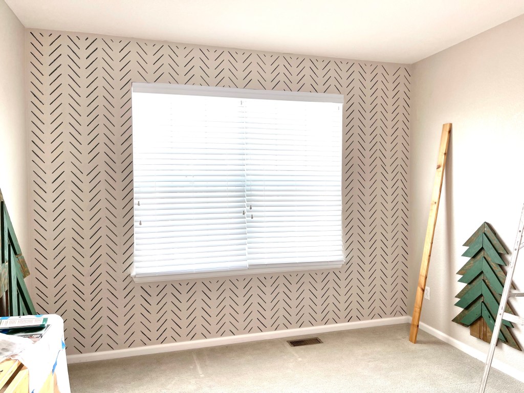 I used a herringbone stencil to paint the window wall. The stencil was pretty easy at first but then once I got to the other side of them wall it got a little difficult to keep the pattern without getting paint on the adjacent wall.