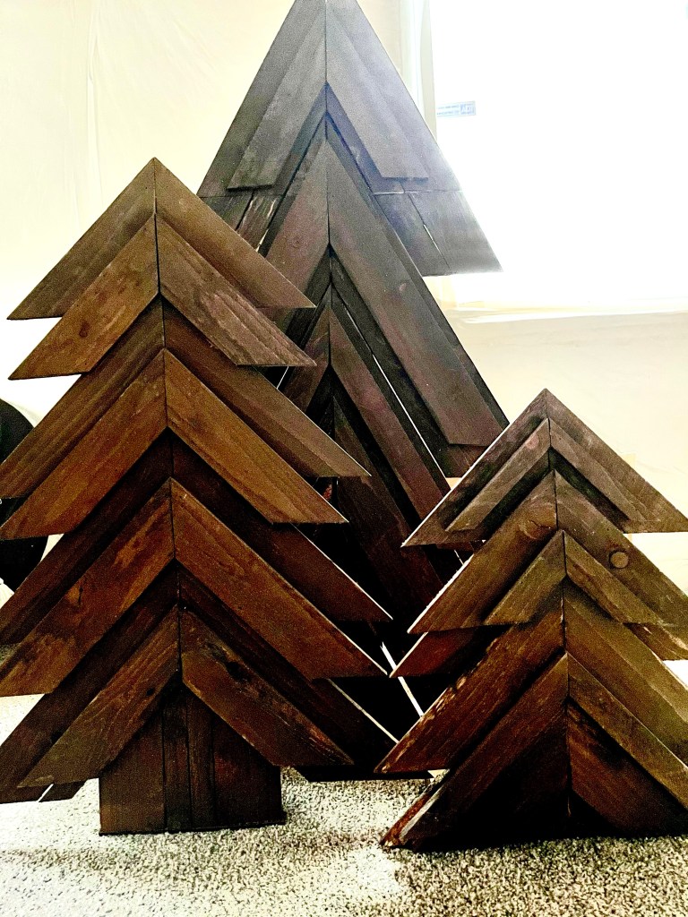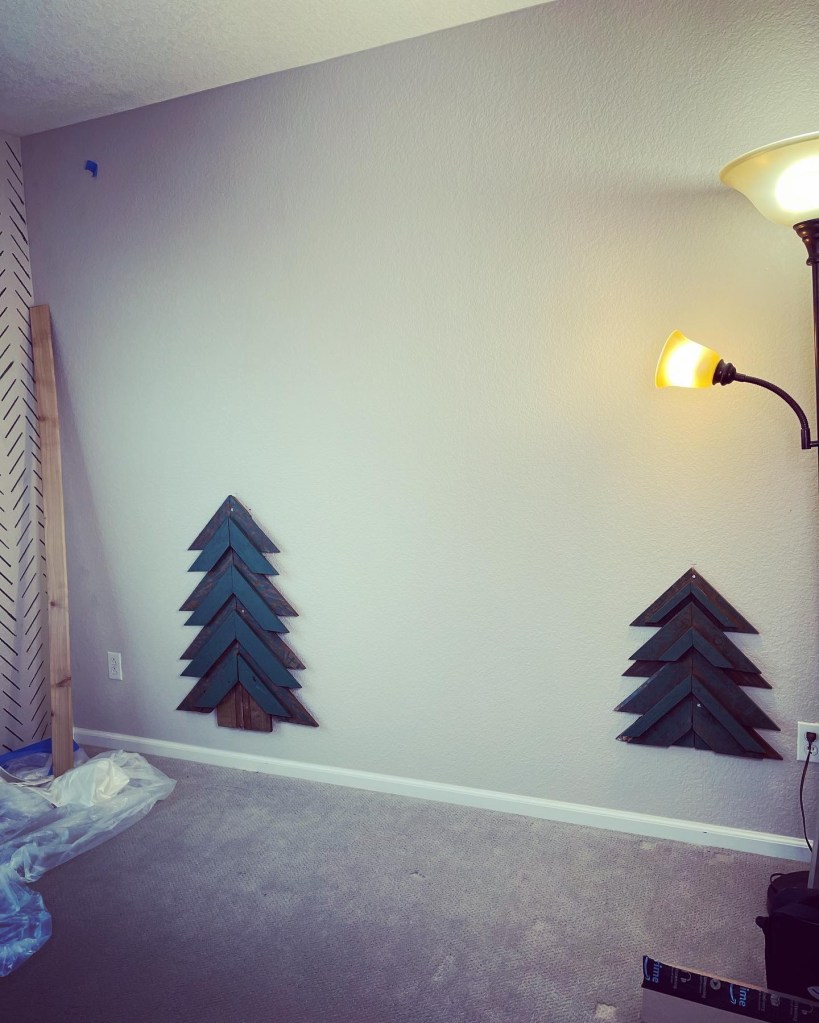 I got these wooden trees last year. Our neighbors were throwing them out after Christmas. Luckily my husband saw them throwing them out and I ran over and asked if I can take them off their hands. They have a chevron pattern to them so I thought this would go perfect with the stencil wall.