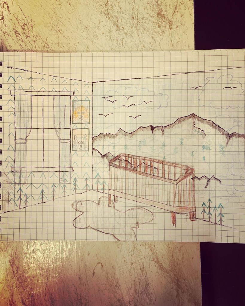 The theme I wanted to go with was Forest/Woodland Creatures. Here is my original idea for the Baby’s room. I bought a stencil that I am going to use to make a herringbone pattern on the window wall. I also got a bunch of pictures of Woodland Creatures pictures that I am going to frame. I was originally going to create a mural with mountains on the main wall but decided to use decals that I bought instead. I am so tired of painting after painting so much at the vacation rental.