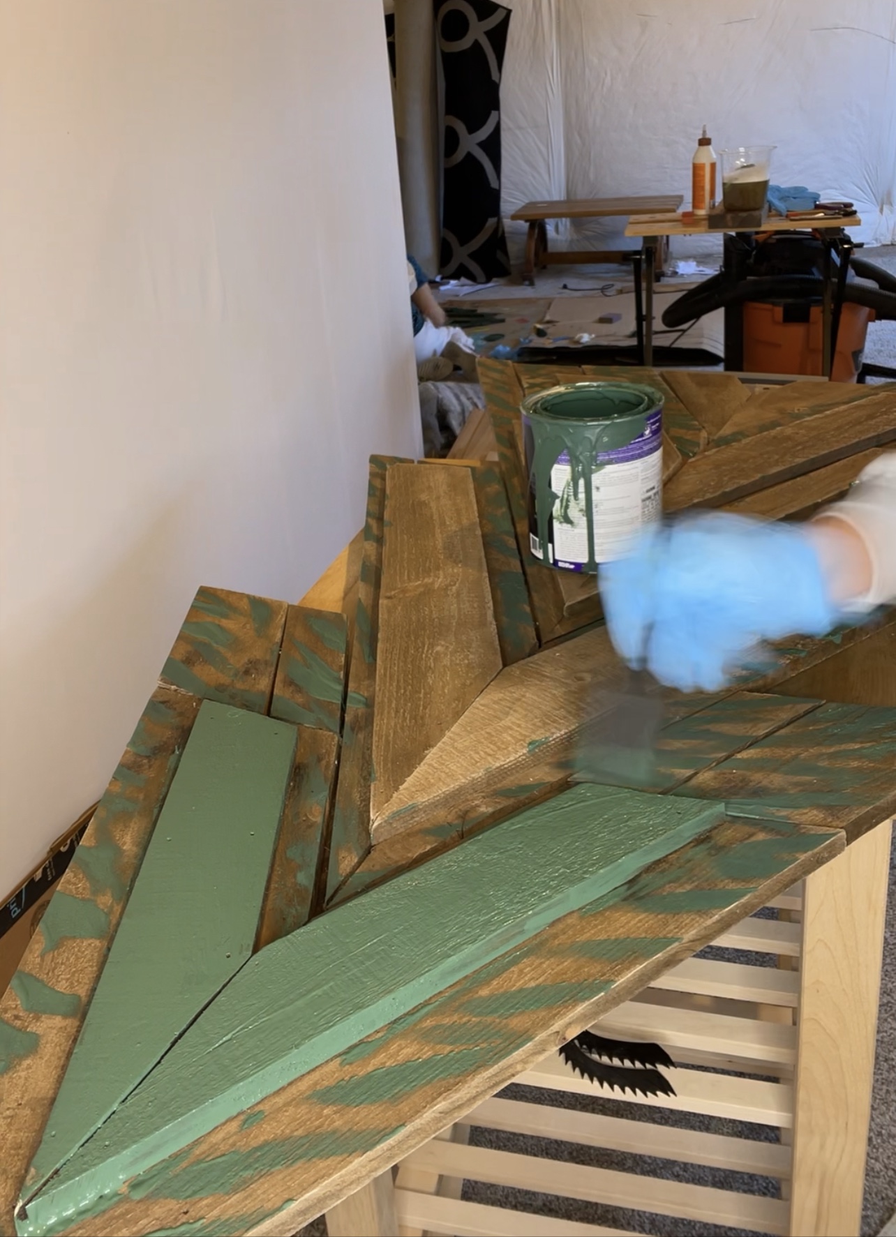 I cleaned up the trees and sanded them. Then I removed the stands in the back so I can nail them flat on the wall. Using a sponge paint brush to make bristle like brush strokes on the inner parts of the trees. Then I painted the outer parts of them a solid green. I thought this helped to create some dimension.