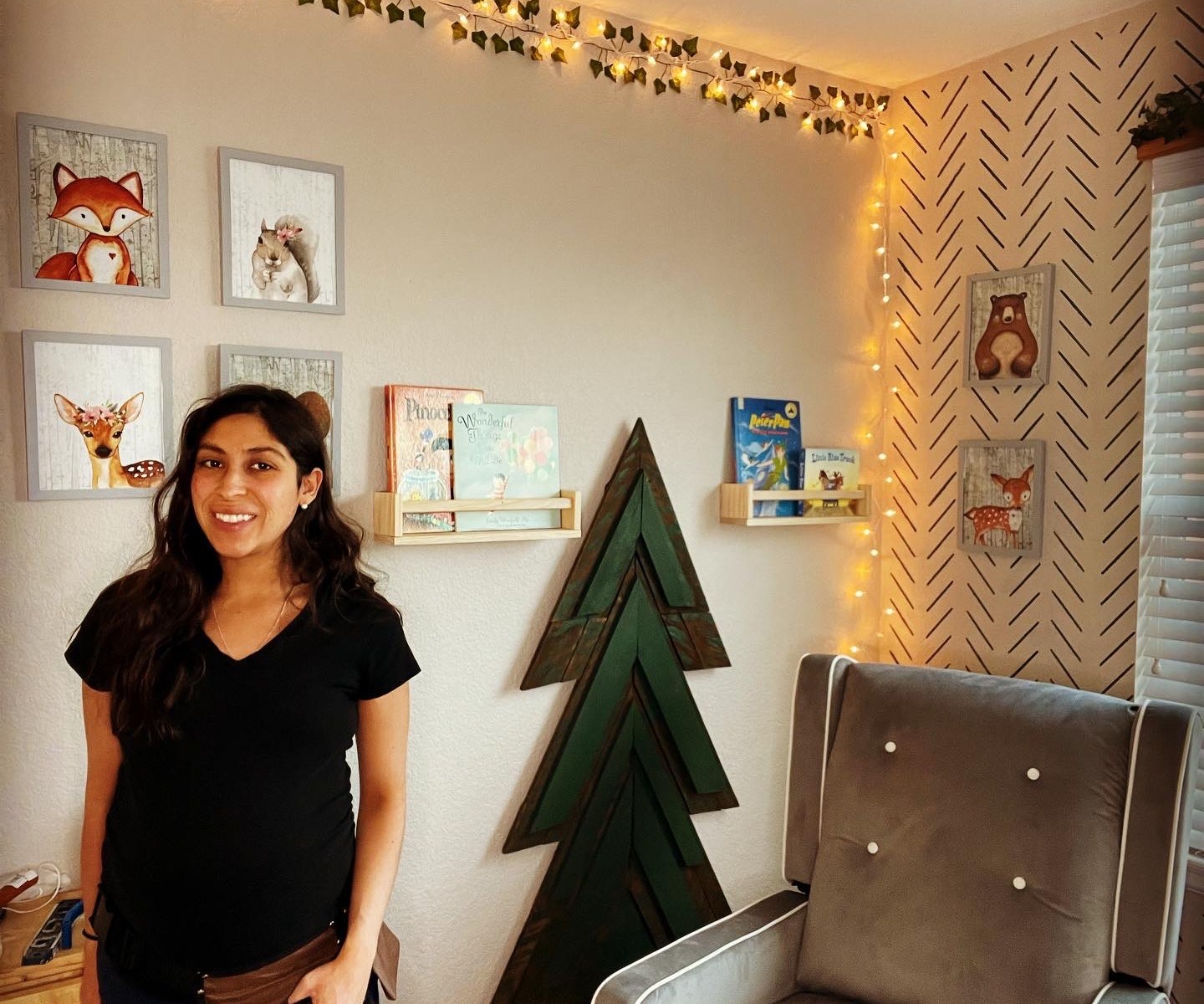 I bought some twinkling room lights in order to create a more magical feel. I weaved them into the leaf border across the wall. Here is how it turned out.