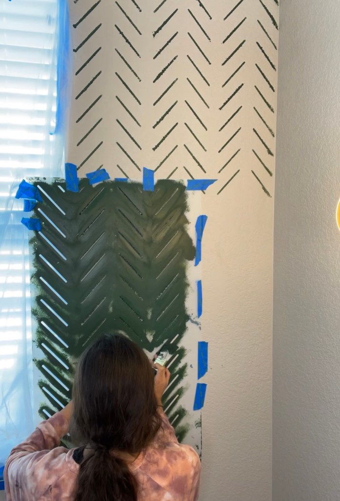 Start from the top corner of the wall with the stencil. Use painters tape to attach stencil to the wall. Line up the stencil on the wall how you want the pattern to appear. It is important to keep the pattern consistent as you go.
