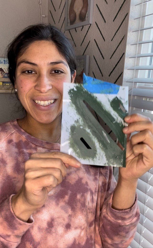 There will be some gaps in the design from where you moved the stencil down. Use the smaller stencil in the kit to fill in the gaps.