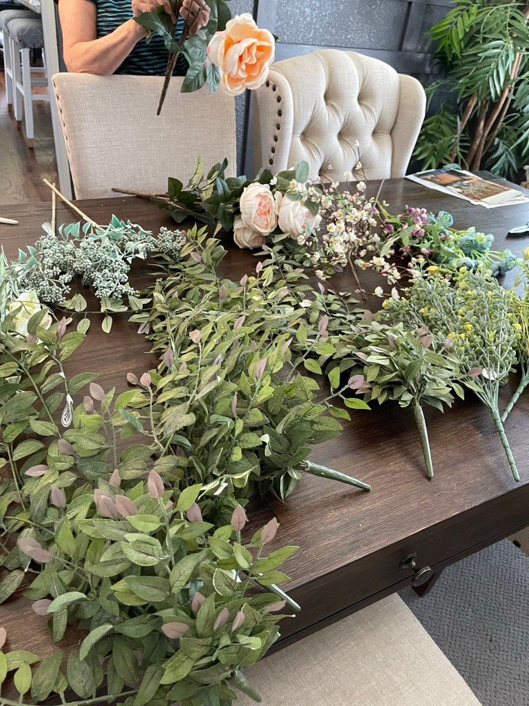I bought the faux flowers from Hobby Lobby. I picked florals for different levels. I bought taller pieces and ones that were more for the center. In my design I knew I wanted to create a draping effect over the planters so I bought some pieces to hang over the planters.