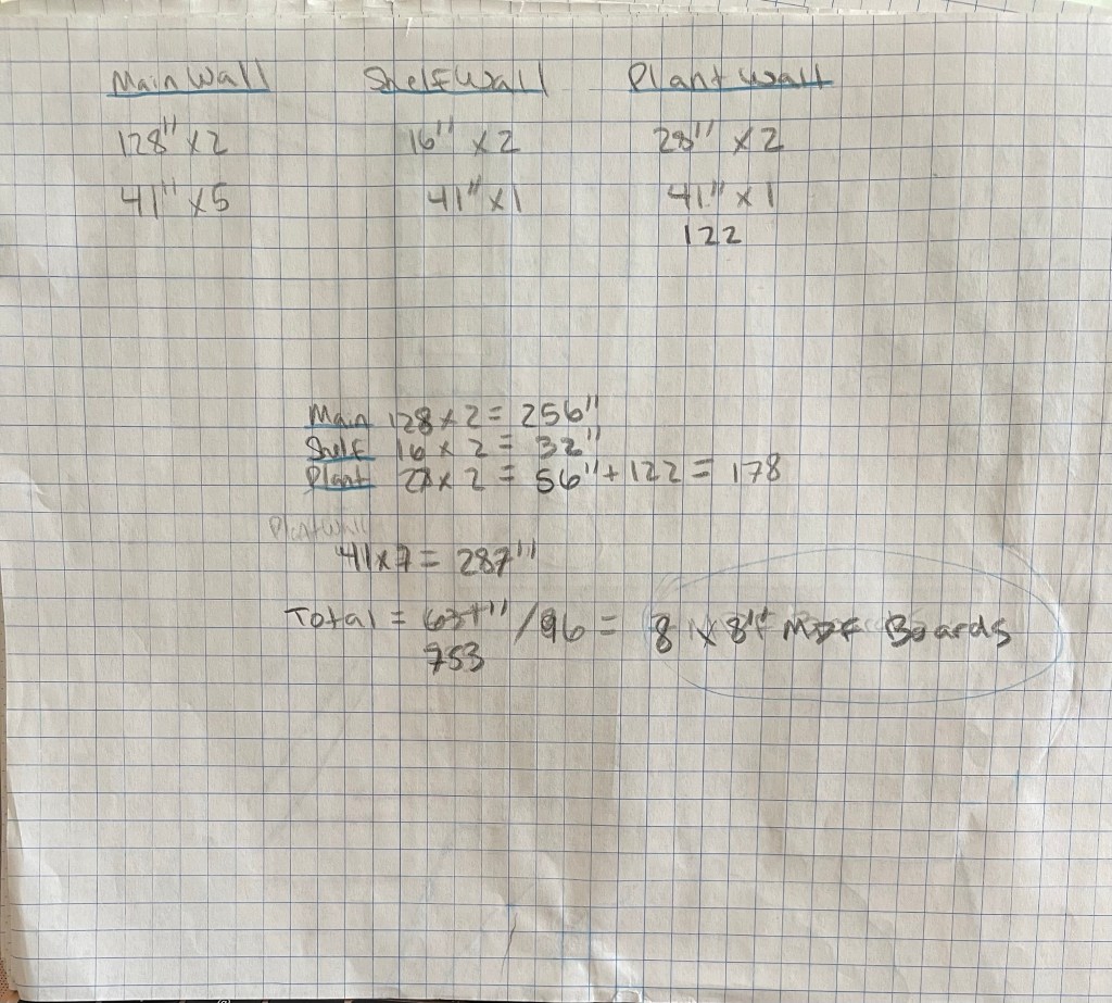 I separated the measurements by wall and then totaled it up at then end to determine how many MDF boards I needed.
