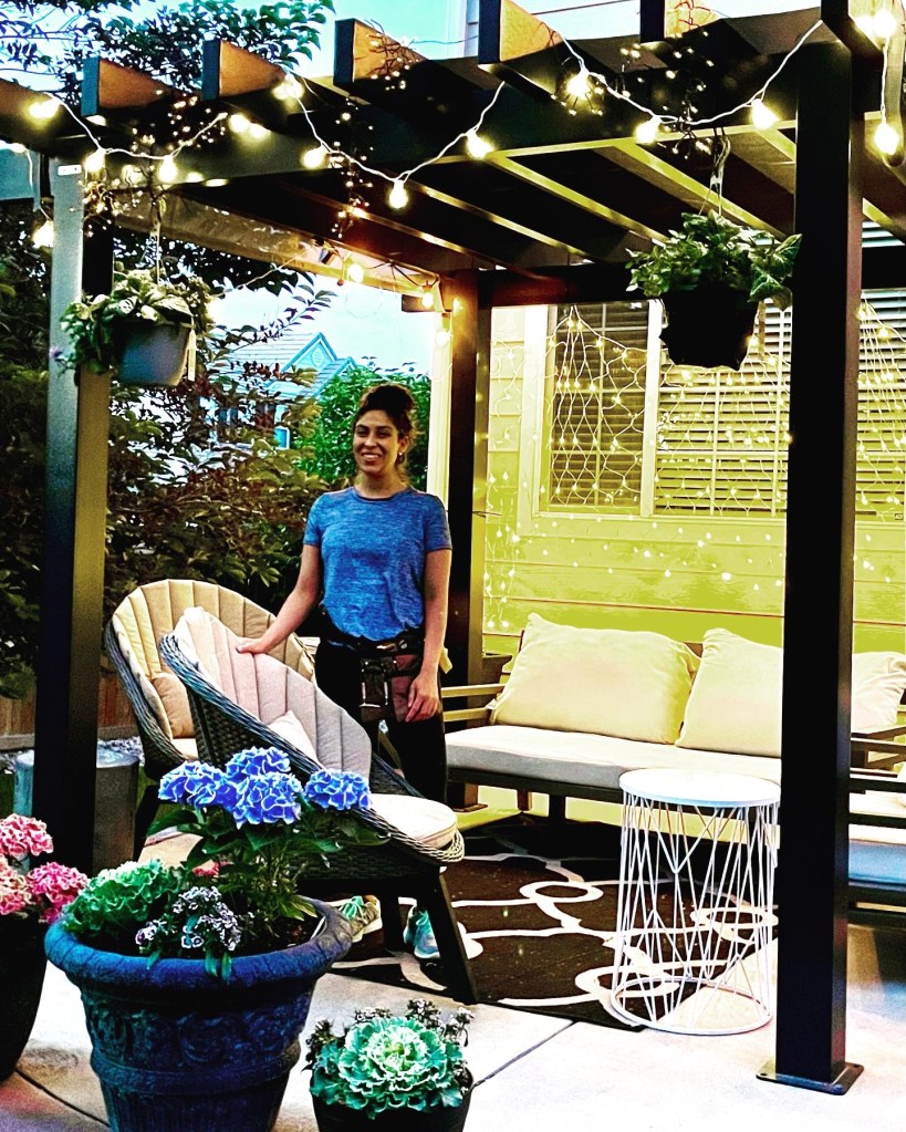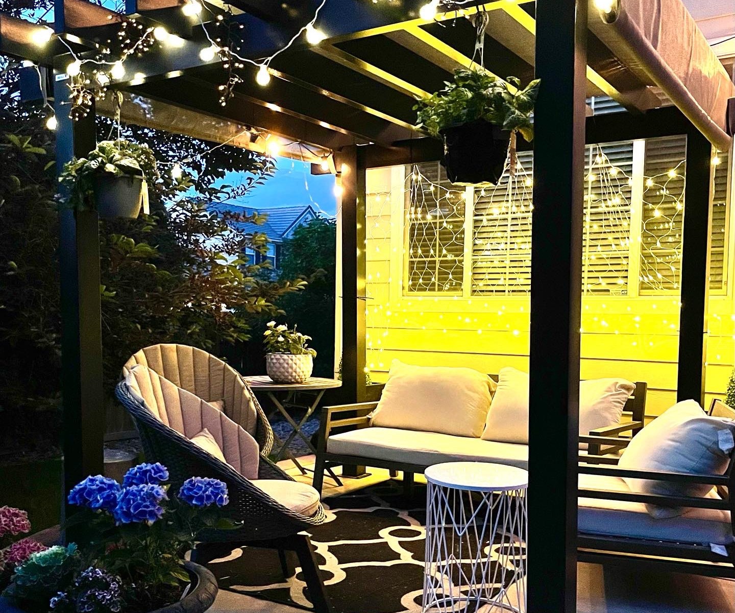 I added about three sets of string lights to the Pergola. We already had some attached to the wall, so I just attached the pergola ones to the existing, so it looks like an extension off the wall.