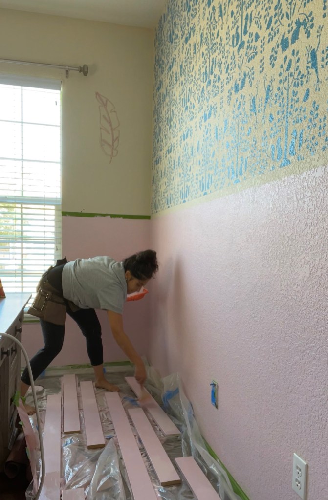 The first thing I did was paint the walls. With Board and Batten I have found that it is best to paint the wall and the boards separately first that way you get better coverage and its easier at the end. You just have touch ups and don’t have to worry about getting in those hard to reach places once the boards are up on the wall. I used Creamy Freesia by Behr. I sanded the wall and it made it go so much faster.