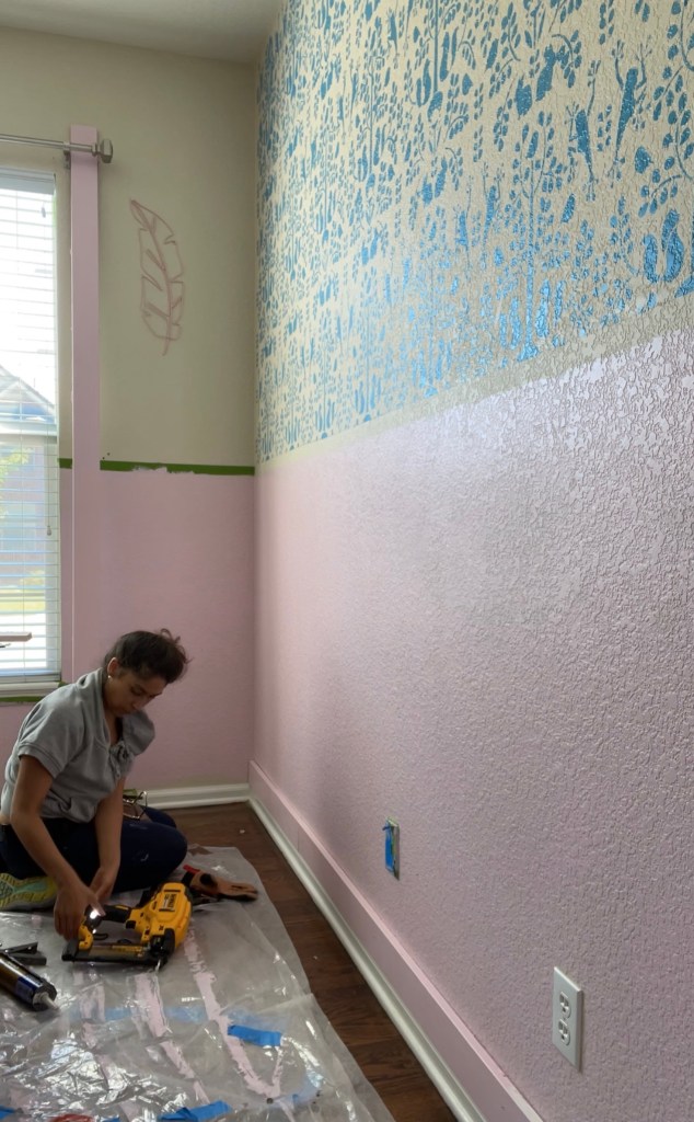 The Vertical Pieces I measured about 27.5 in between each board. I put the first board against the corner of the wall. Then I measured 27.5” to the left and marked that on the wall. I used a level to place the next board to make sure it was straight. I squeezed the liquid nails onto the board and placed it using the level to make sure it was straight and then nailed it with the nail gun on the wall. Then I did that again till I got the other end of the wall.