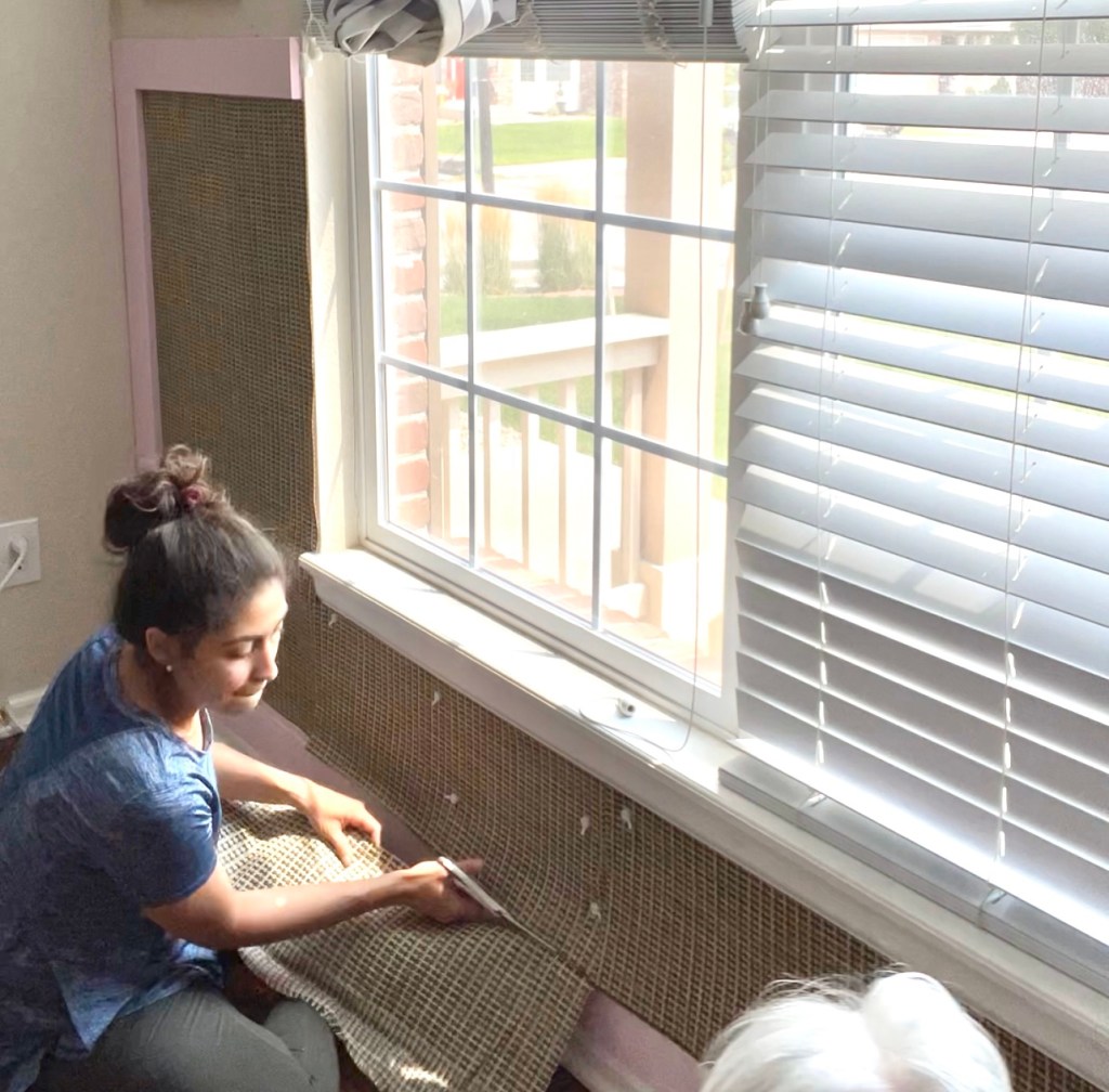 I covered the inner sections of the board and batten with the fabric and marked the sides where to cut. I added some slack in my markings to make sure I didn’t cut the fabric too short. I cut the large pieces of fabric with the rotary fabric cutter.