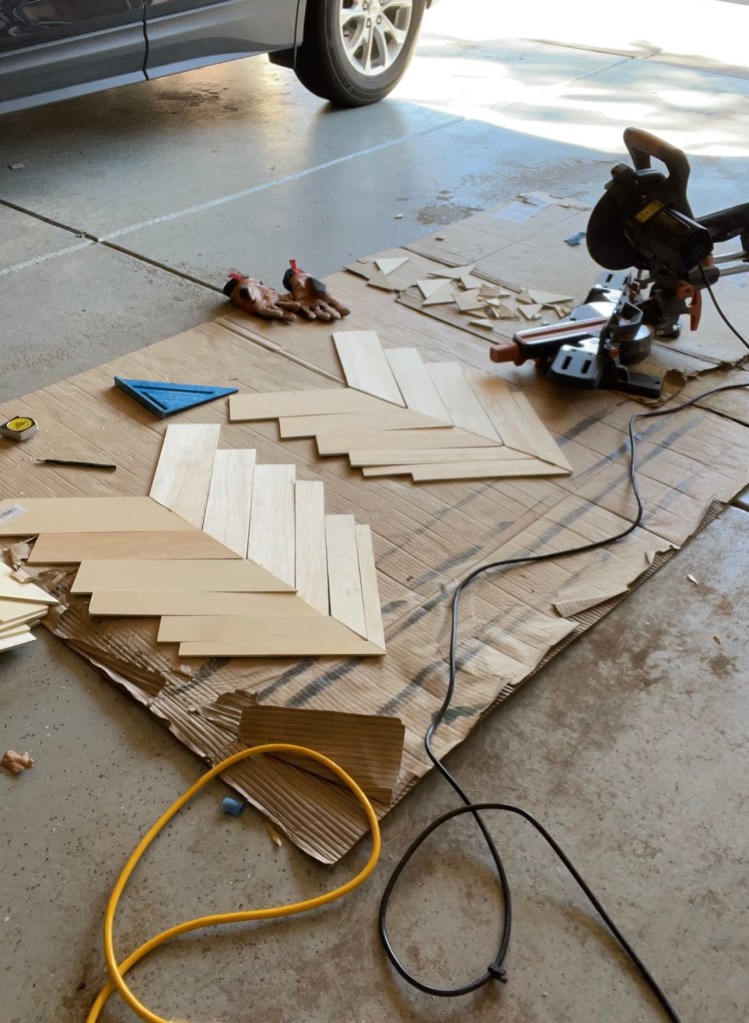 Since the sande wood was so thin I used the leftover triangle pieces that were created from steps 2 and 4 when I cut my angles and placed them on the back of each chevron piece. Then I used flat corner brackets to secure each chevron layer together. (I had to use 5/8” wood screws)