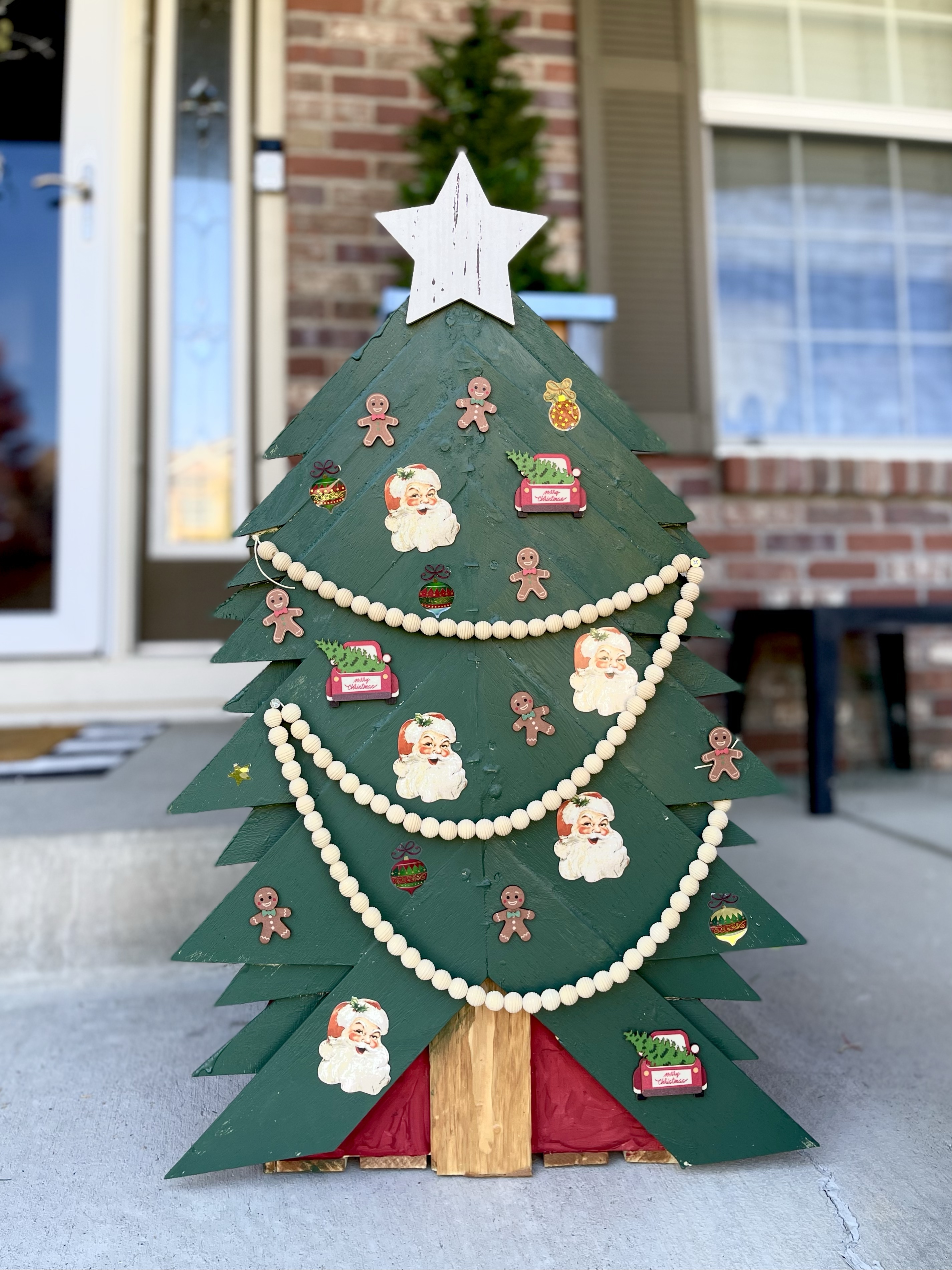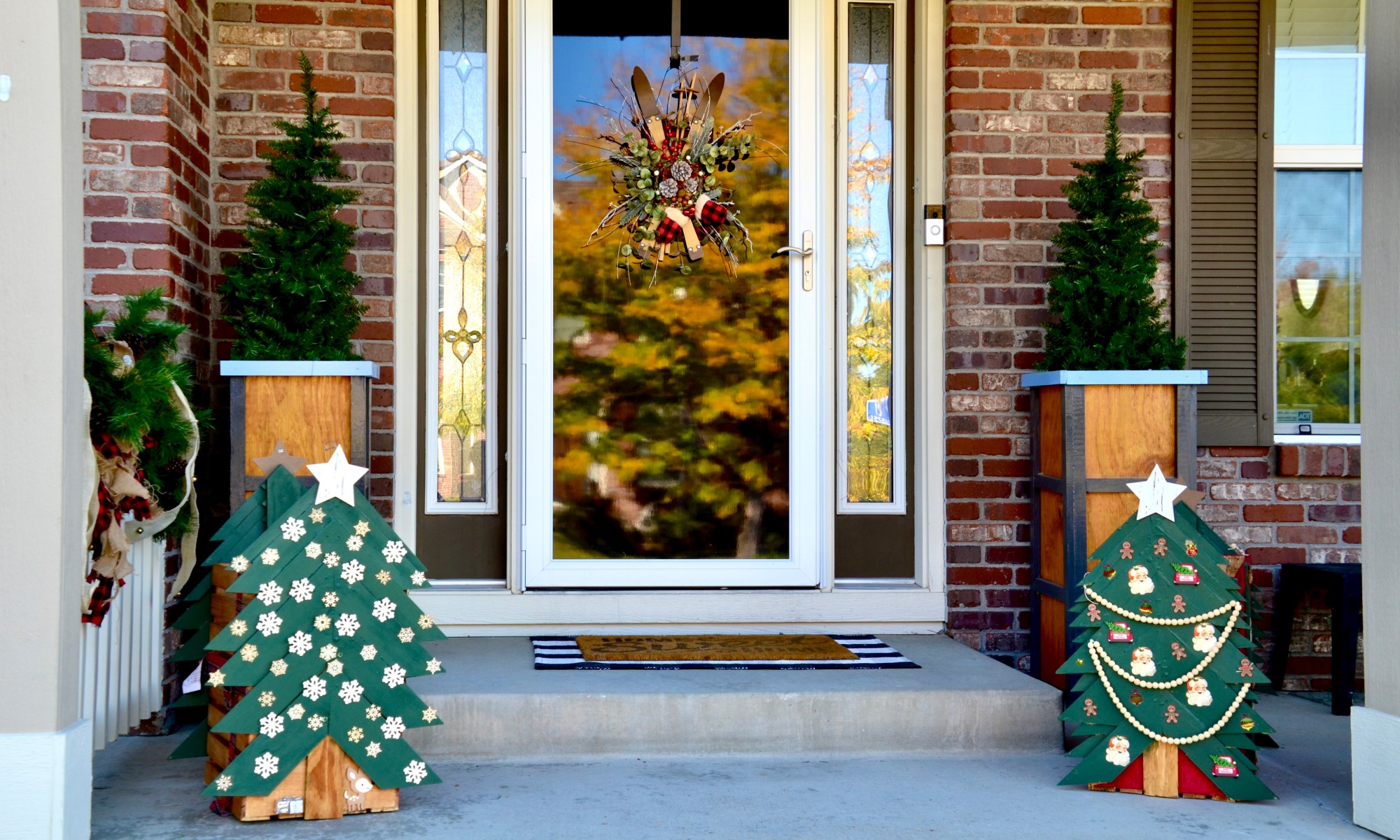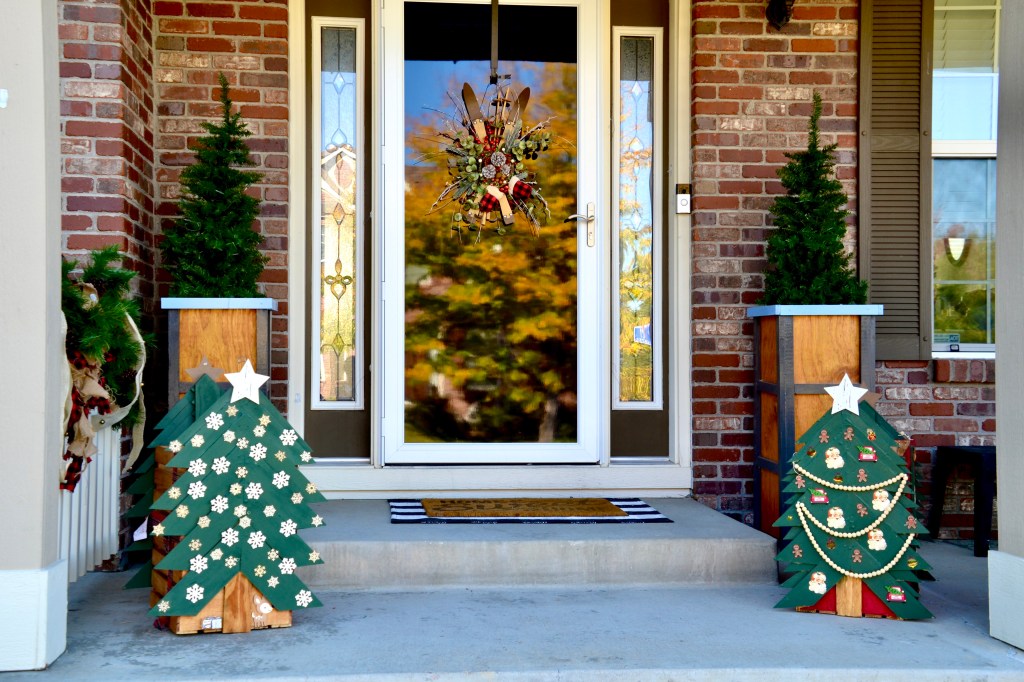 My plan is to build wooden trees that attach to the front and back of crates. This way passersby would mainly see the trees on the porch and not all the packages everywhere tempting porch pirates. I am putting a sign on the side of the crate (the side not visible to the street) that says “Santa’s Gifts” so that the delivery person could see these are for packages once they got onto the porch.