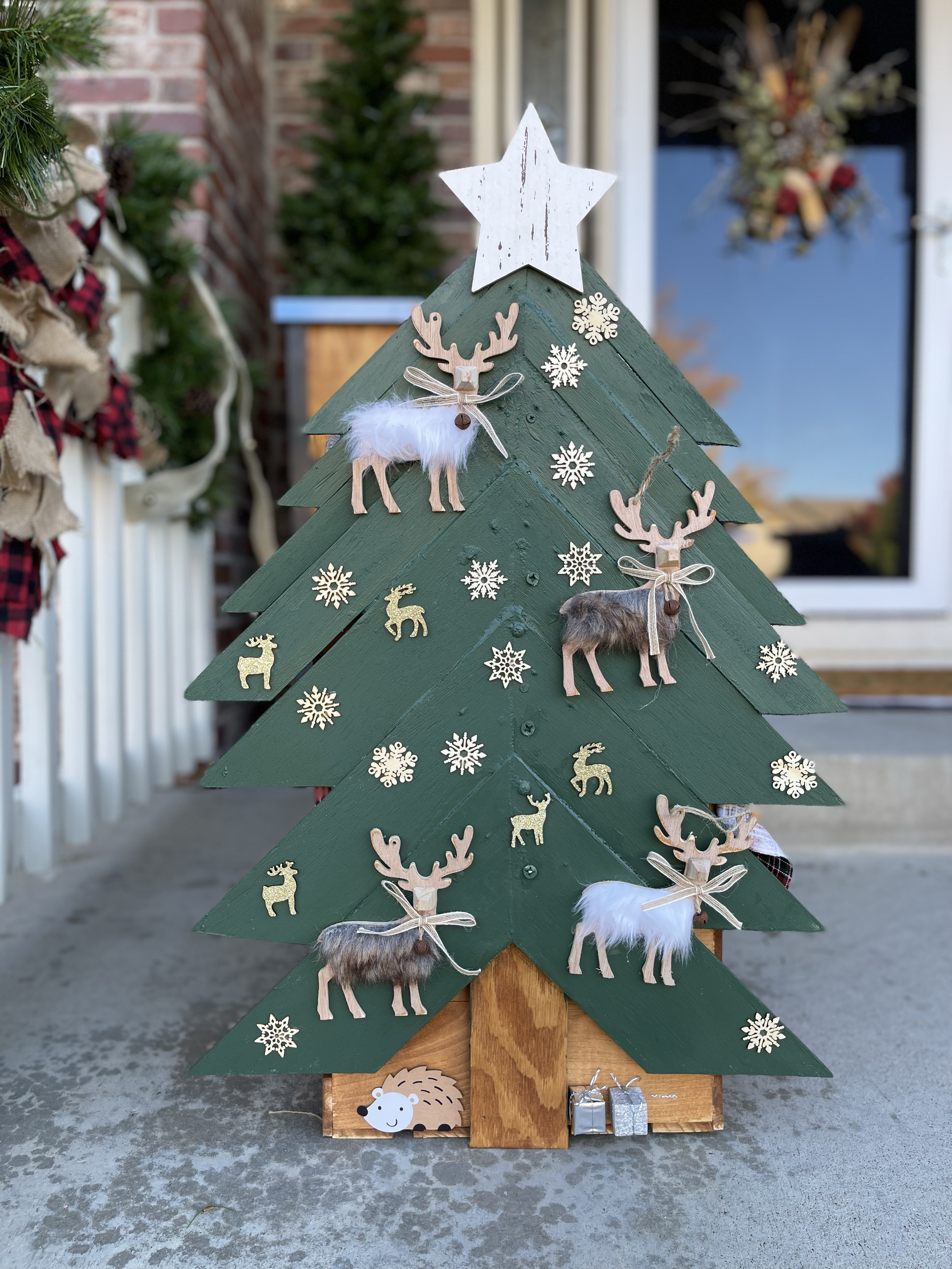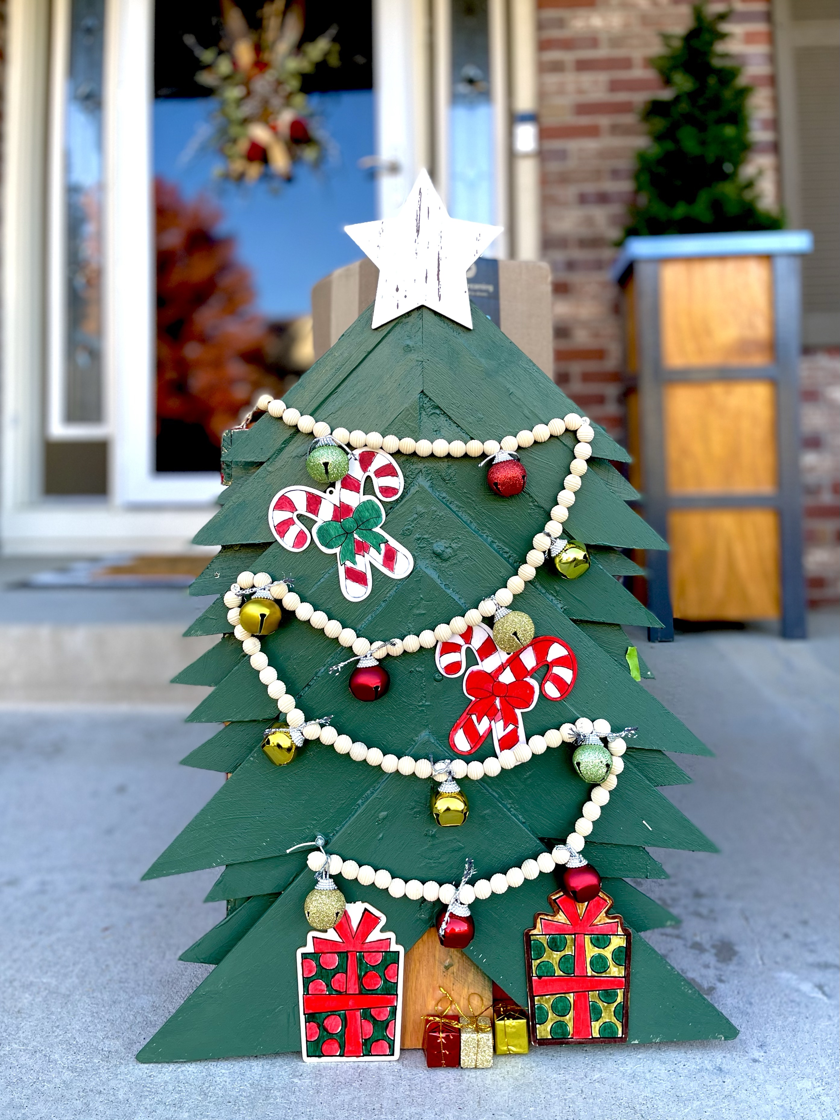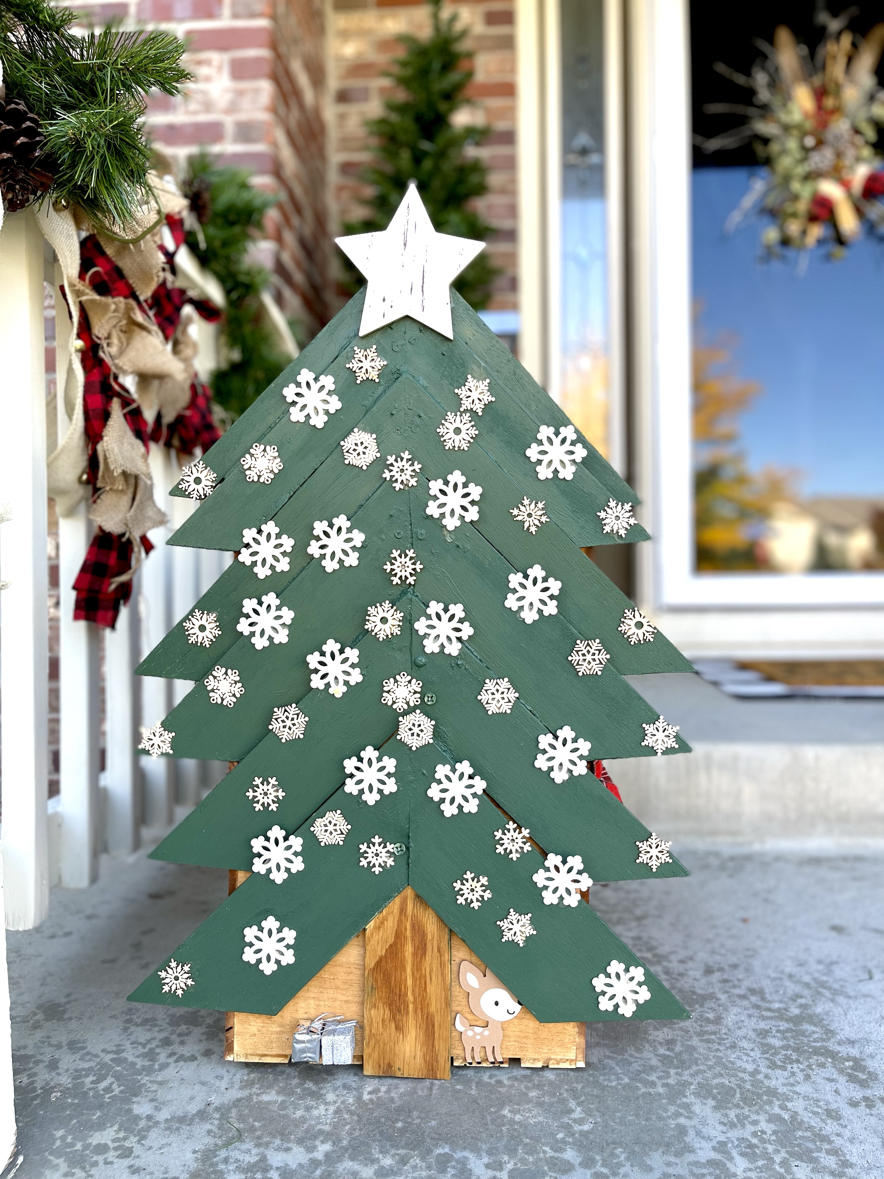 My plan is to build wooden trees that attach to the front and back of crates. This way passersby would mainly see the trees on the porch and not all the packages everywhere tempting porch pirates. I am putting a sign on the side of the crate (the side not visible to the street) that says “Santa’s Gifts” so that the delivery person could see these are for packages once they got onto the porch.