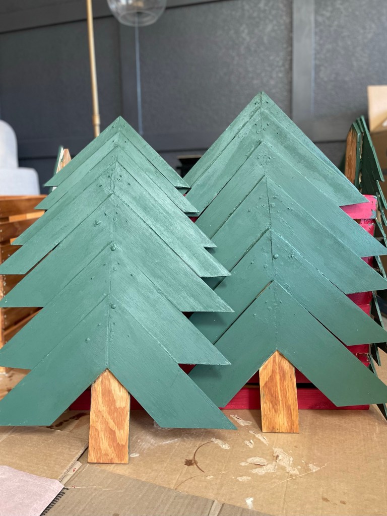 I painted the trees using Behr paint (Vine Leaf). One of the boxes I painted the trees before I attached them but on the first one I forgot to do that so I recommend painting them before attaching.