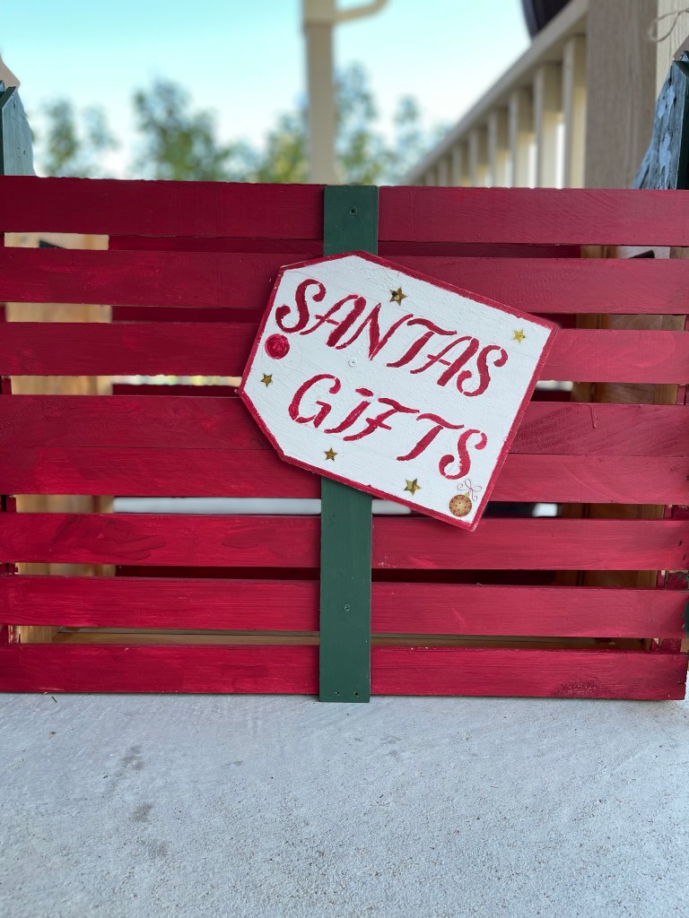 This is the part where you can add your own decorations and get as creative as you want. I made a tag that says Santa’s Gifts from leftover plywood. I used a Mitre saw and cut it into a tag shape.