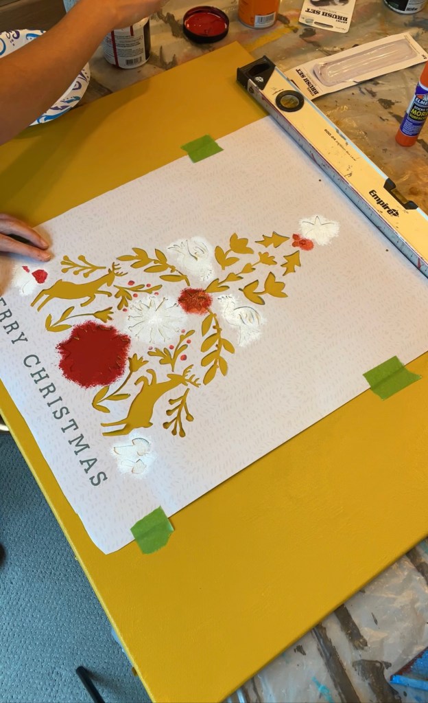 I found this gift bag and loved the print so much I decided to make it into a stencil for my canvas. I used the canvas I painted Tumeric. I cut out the shapes on the bag and used a stencil brush to paint it. This stencil brush was key. I have never used one before and it worked so well and it made the project so much easier.