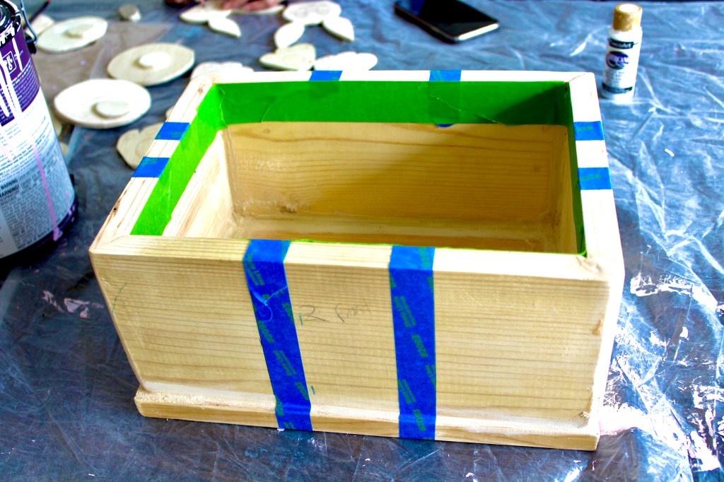 I used sharp lines painters’ tape to make the stripes. On the long sides of the box I measured 4 inches in from the sides to make the stripes. On the short sides of the box I measured 3 in in from the sides to make the stripes. I used a level and drew a line and then added the painter’s tape along those lines.