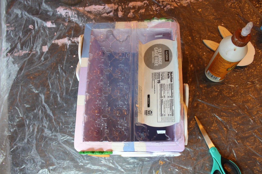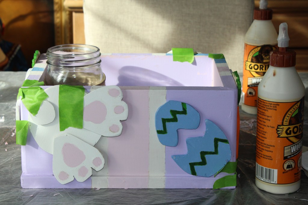 I glued all the shapes onto the box and then held them on with Frog Tape till the glue dried. I let it sit overnight and then I took the tape off.